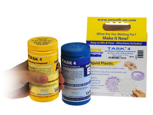TASK™ 4 is a unique polyurethane casting resin that is very strong when cast in Ultra-Thin sections ranging from 0.03” to 0.50”(0.075cm to 1.27cm). TASK™ 4 has a very low mixed viscosity, ensuring flawless pick-up of even the finest detail. Cured plastic exhibits very low shrinkage which is why this plastic has become a favorite of prototype and design professionals throughout the world. Pot life is 20 minutes and cure time is 16 hours at 73°F/23°C.