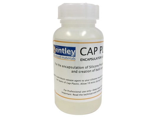 To use Cap Plastic for encapsulation - 2 parts IPA : 1 part Cap Plastic. Spray Ease Release 800 into a silicone mold or plastic mold. Allow to dry and then brush 10 layers of Cap Plastic into the mold allowing each layer to dry. Each layer to be brushed into detail and over the edge as a flange. Pour into detail Ecoflex Gel or silicone until detail is full but not overflowing. Brush a narrow overlap of gel or silicone over cap plastic, just 1 or 2mm. Allow silicone to set. Brush a further 5 layers of Cap Plastic over the back of the gel or silicone and continue onto previous applied layers of cap plastic, allowing each layer to dry. Talc the back of the encapsulated gel or silicone. Slowly remove the encapsulated piece from mold and talc the front face. Trim to neaten encapsulated appliance but leaving a 5mm edge of cap plastic to blend onto skin. Encapsulated piece is now ready for use. Each layer of cap plastic should take around 10 mins to dry.