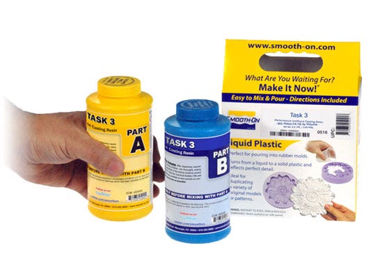 Product Documents - Data Sheet / Health & SafetyTASK™ 3 is white. It has high tensile and flexural strength, as well as high flexural modulus. This plastic was formulated for a variety of industrial applications including pattern making and making prototype models. This resin is designed for casting in thicknesses up to ½” (1.27 cm). TASK™ Plastics are moderately priced and are available in trial kits, one-gallon, five-gallon, 55-gallon drum and totes.